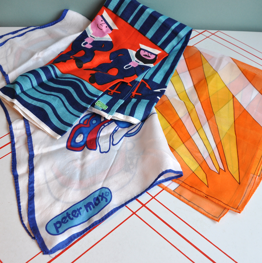 So my sister's visiting from Dublin for a couple of weeks and she had a hankering for Mas Tapas in C'ville. We stopped at a few junk shops on the long drive down. At one shop, I found a retro abstract orange scarf (I can't resist the color) and a silk Peter Max scarf. Funny, how one finds multiples all at once. If you remember, I found one earlier this month Peter Max